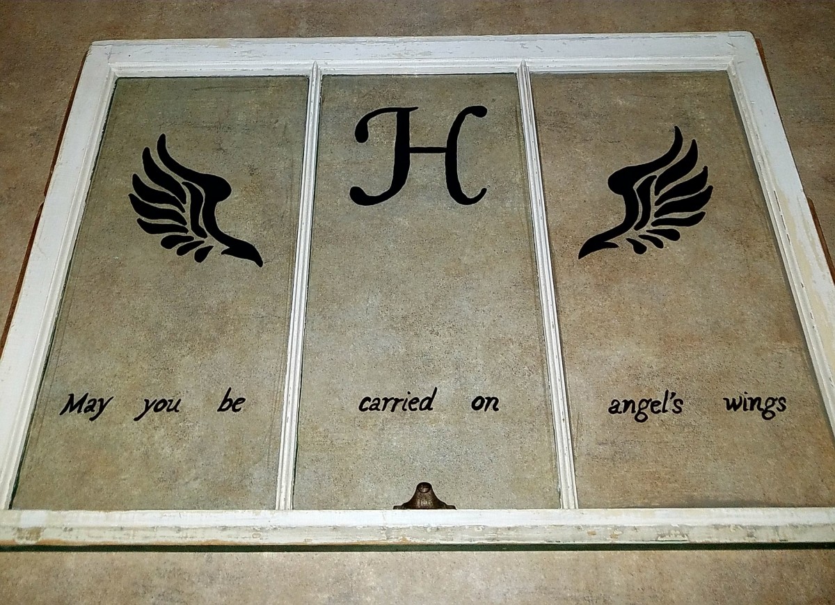 I washed it, sanded it and painted the design with black acrylic paint. The design is a combination of graphics enlarged on the photocopier and taped to the opposite side of the window. From there I traced the design with my paintbrush. I used 2-3 coats of paint to fill the design.
