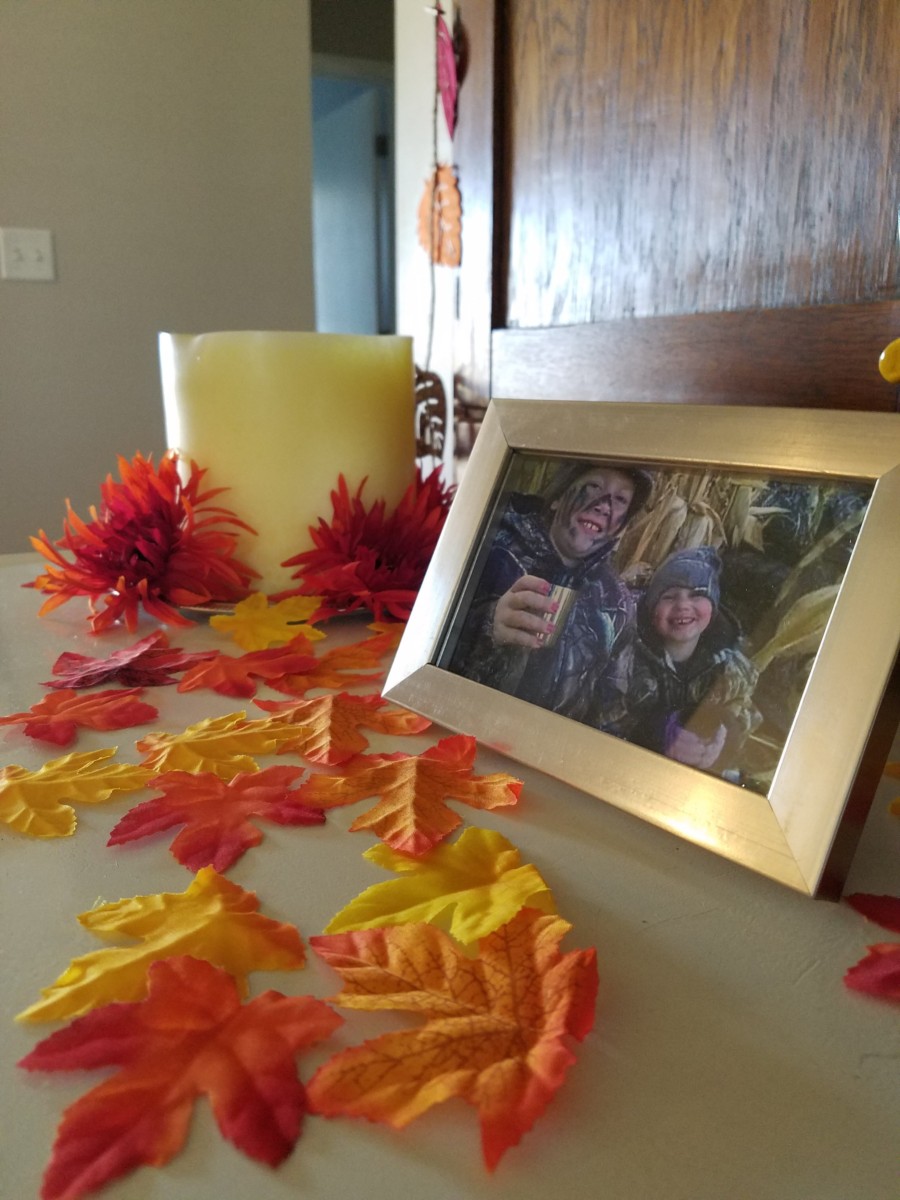 Table Decoration – Leaves, flowers, and framed photo adds a touch of warm fall color.