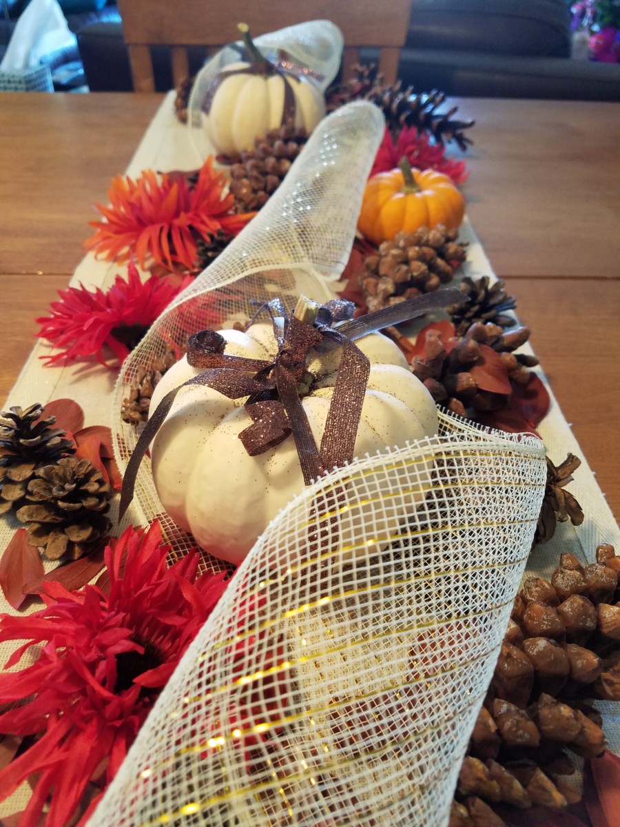 Fall Center Piece – Flowers and ribbon from the Dollar tree add sparkle and color to my table centerpiece.