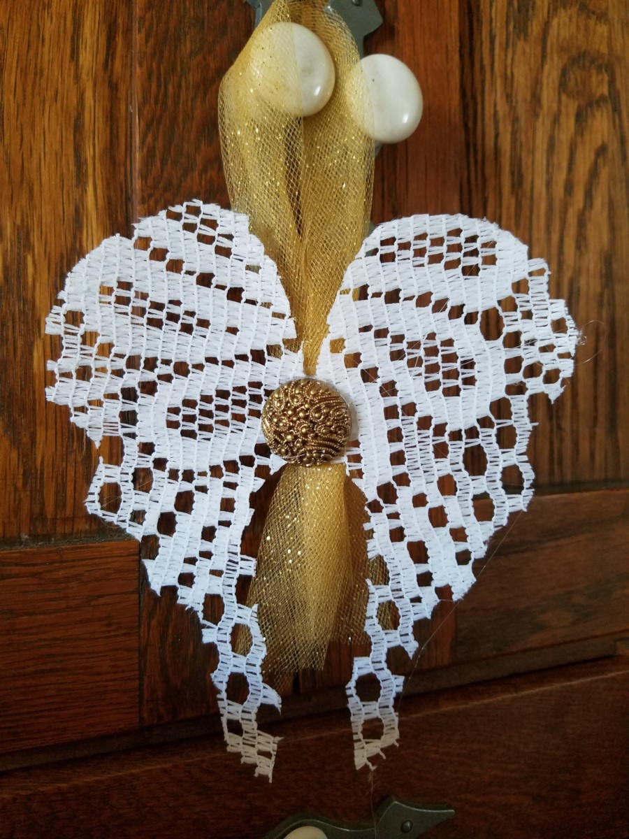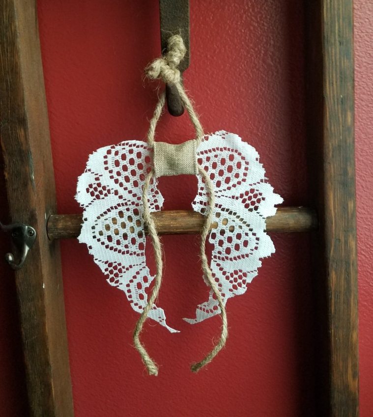 I found these lace doily’s at the Dollar Tree and immediately thought…wings. I had no idea how, but I was going to make something happen and this is what I came up with. Some buttons, ribbon, Modge Podge and voila … wings!!