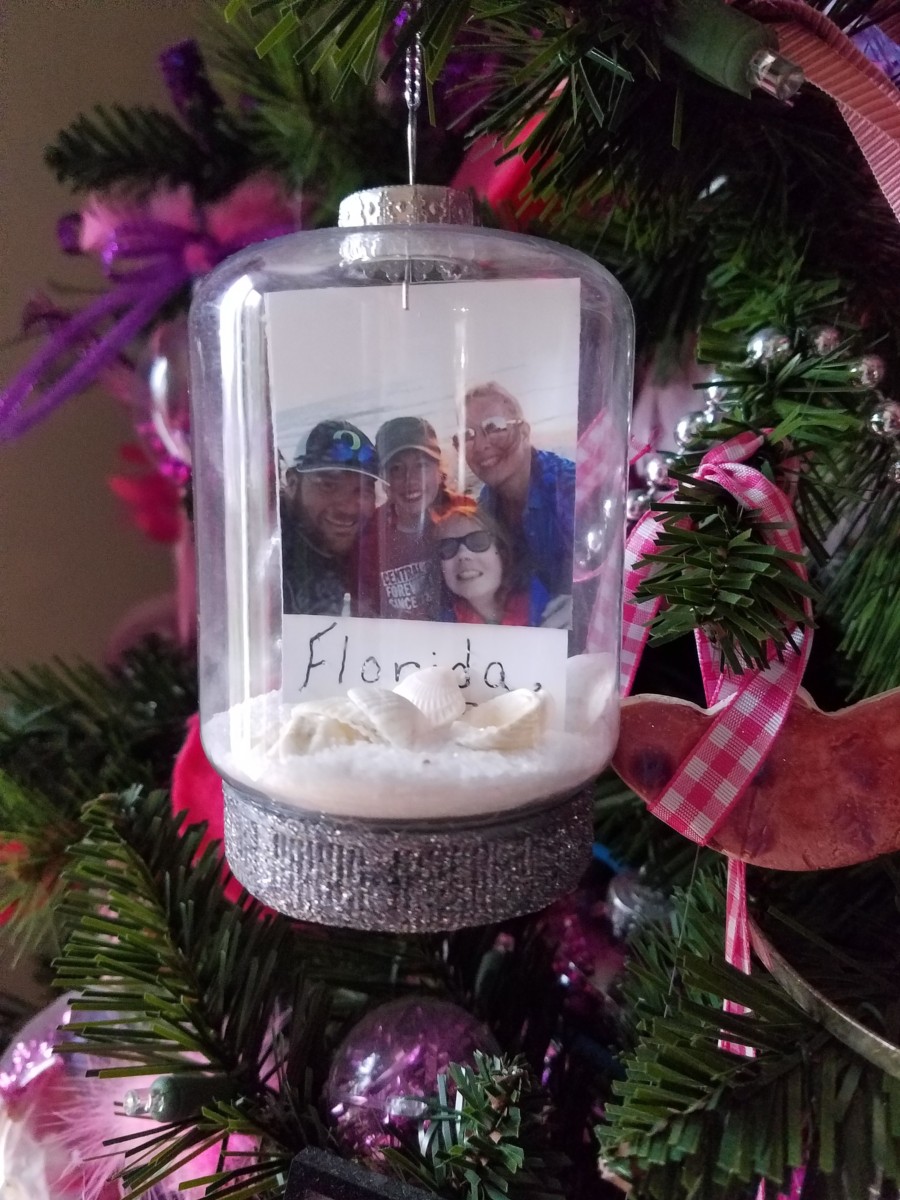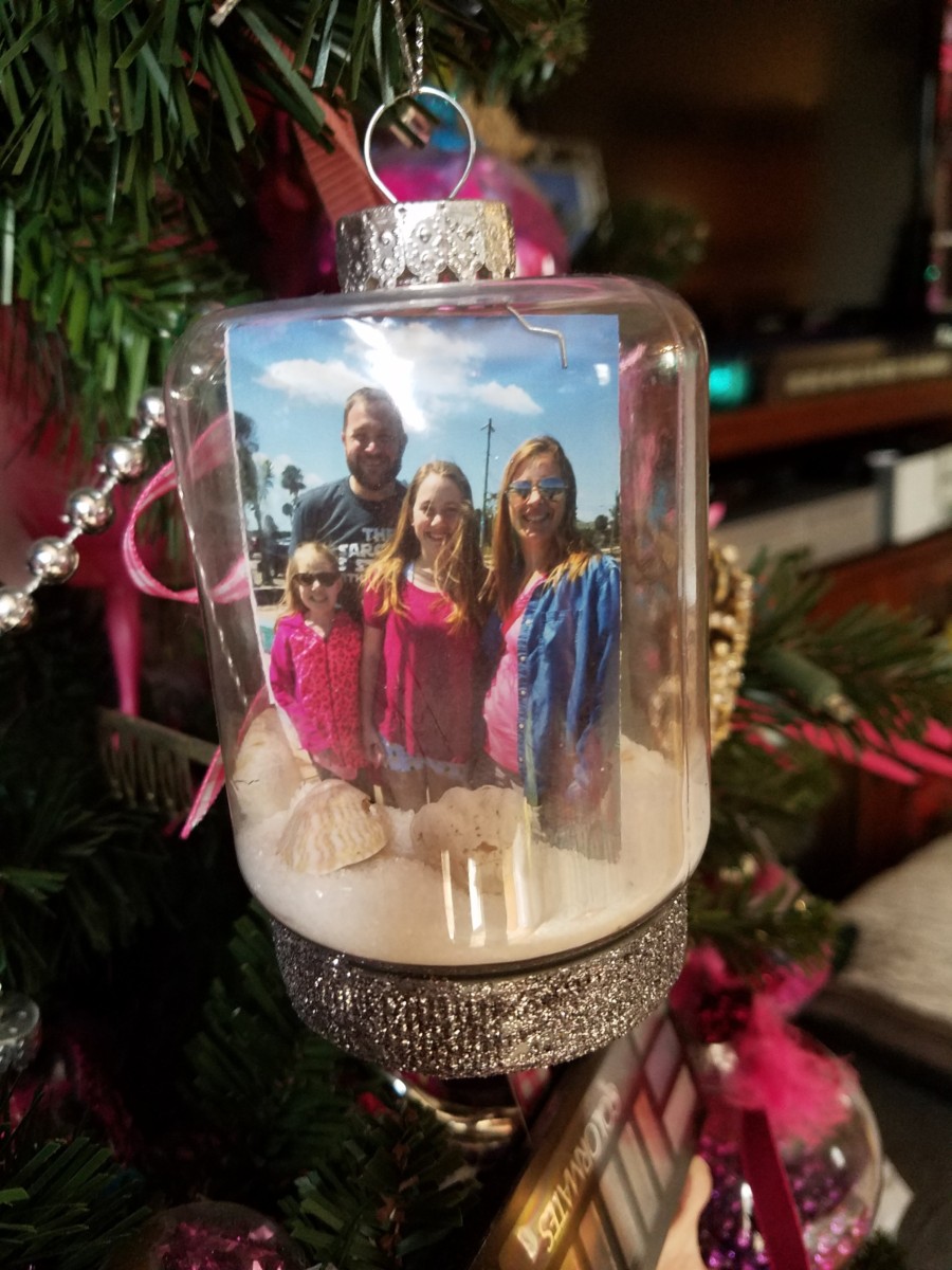 Last year I wanted to capture our last trip to Florida in a Christmas ornament. Following several Pinterest pins, I just couldn’t get it to turn out using a standard ball ornament. A few weeks ago I was shopping at the Dollar Tree looking for treasures and found this jar ornament! I glittered the lid to fancy it up a bit and it turned out perfectly. I ordered wallet size prints from Walgreens and trimmed them a bit to fit. Poured the sand in from the top which helped hold the photo in place and dropped the seashells in. I’m so happy with the way it turned out!